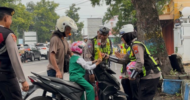 Anggota Satlantas Polres Ponorogo Polda Jatim memberikan cokelat, bunga, hingga helm gratis kepada pengendara yang tertib berlalu lintas.